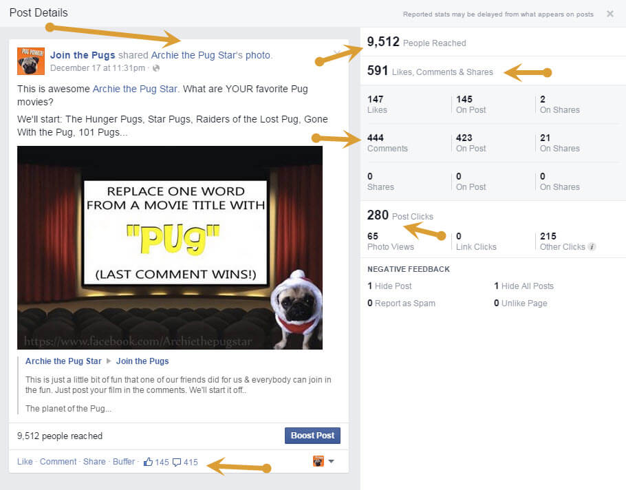 This post (please see image), was shared on Join the Pugs, which is a branded, online, Pug community I created. The Facebook Page has 141.5K “Fans,” and 20K Engaged people as of December 18, or a 7% Engagement rate with $0 advertising spend. Why is this important? With advertising, most pages struggle to reach 5% Engagement, especially if you adjust for Page Likes.